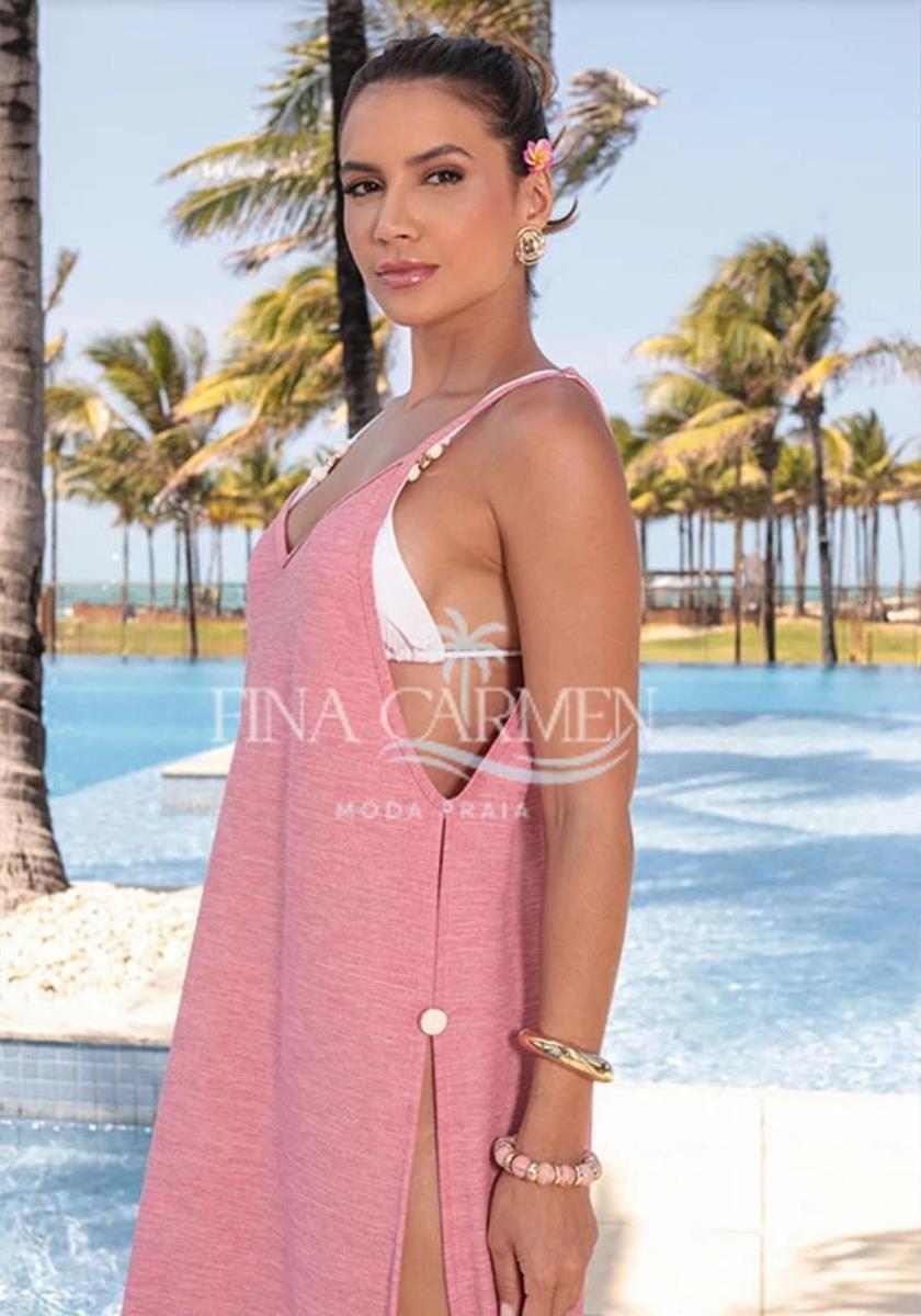 O tom rosa suave valoriza o bronzeado e transmite feminilidade, ideal para compor looks sofisticados à beira-mar, na piscina ou em passeios de resort.