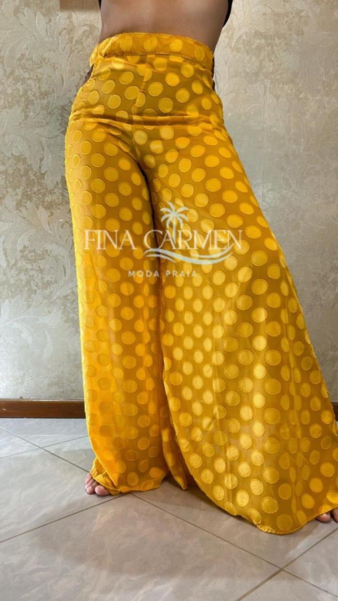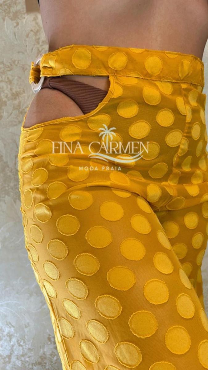A Calça Amarela Solar Chic é a tradução perfeita da energia do verão em uma peça sofisticada e cheia de personalidade. Seu tecido leve com textura em alto-relevo e brilho sutil cria um visual vibrante e elegante, ideal para composições que vão do dia ensolarado à noite à beira-mar.