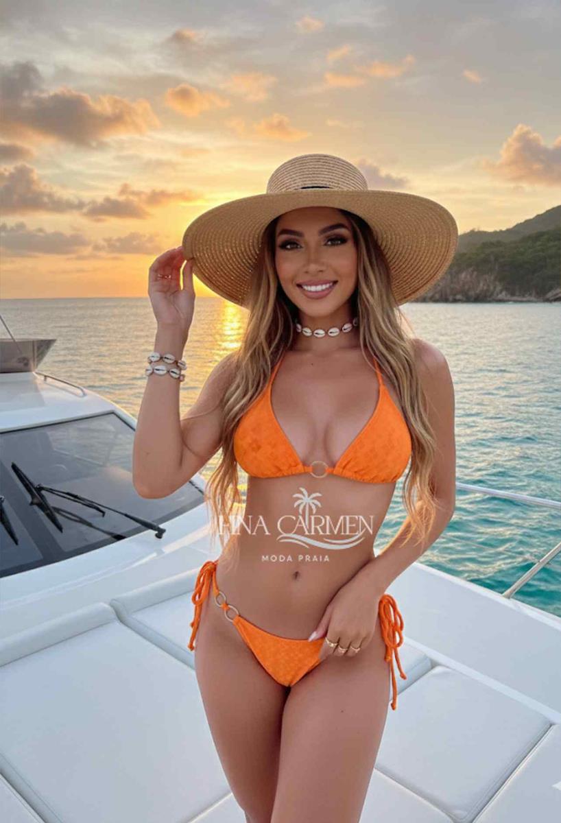 O Biquíni Solar Laranja é impacto visual puro. Um modelo que combina sensualidade elegante com frescor praiano, pensado para quem quer presença — não discrição. O top cortininha com argola central valoriza o colo, cria simetria e realça o busto com efeito lifting natural.