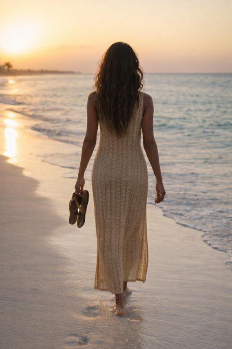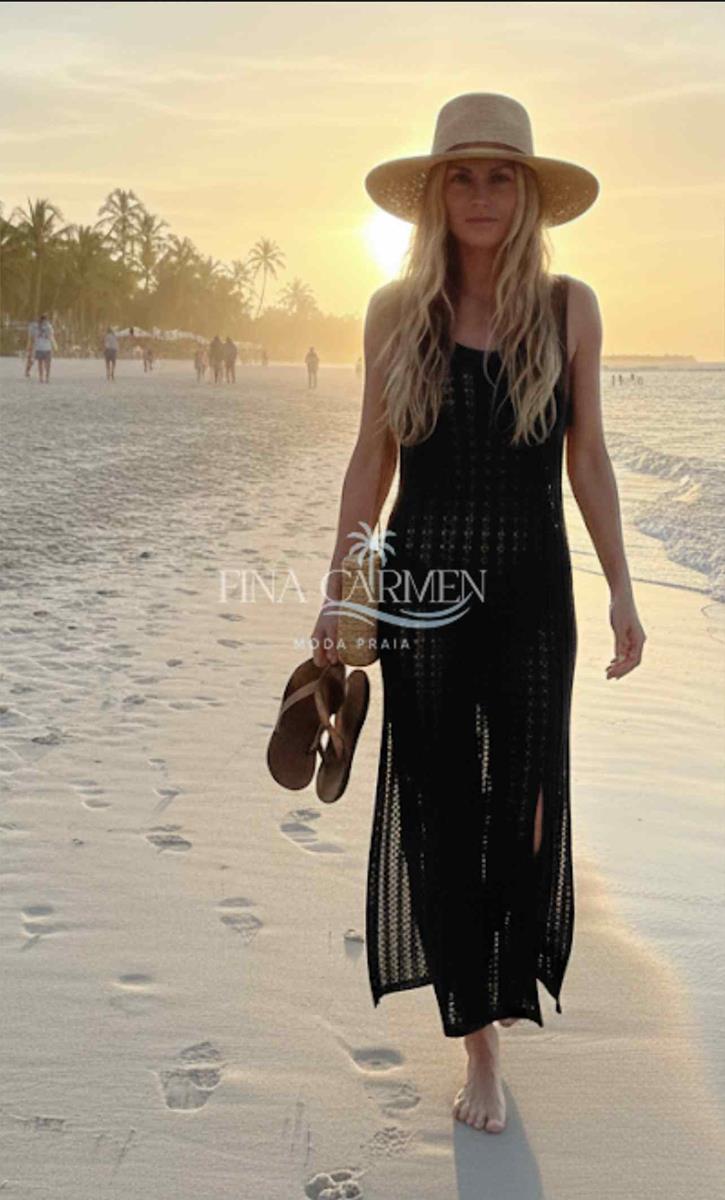 O Vestido Crochet Areia Dourada é a essência do resort chic. Confeccionado em crochê trabalhado, ele cria um visual leve, sofisticado e naturalmente elegante, perfeito para acompanhar o pôr do sol à beira-mar.