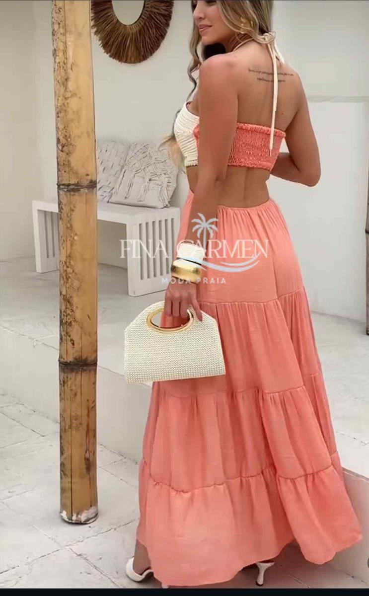 O recorte frontal em V alonga a silhueta e ilumina o look, enquanto a saia leve, com movimento suave, entrega conforto absoluto e estética resort premium. O tom coral suave reforça o mood de verão sofisticado, ideal para quem busca presença sem exageros.