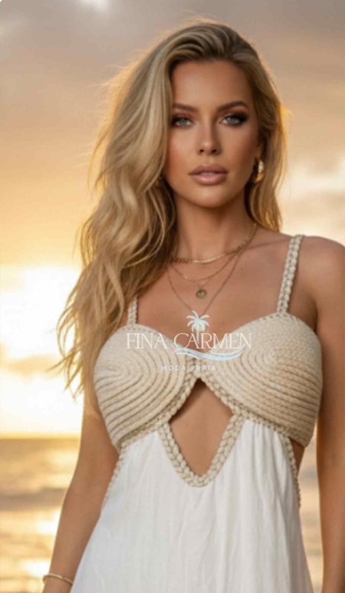 O Vestido Maré Serena une o busto estruturado em tramas artesanais — marca registrada da Fina Carmen — com a leveza absoluta da saia longa fluida. O top em espiral valoriza o colo com elegância escultural, enquanto o recorte em V cria um ponto de luz que alonga a silhueta.