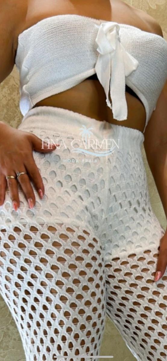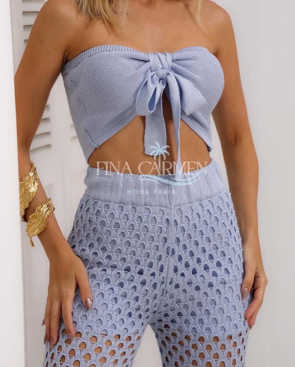 O conjunto Laço Céu de Verão traduz elegância e leveza em um visual moderno e encantador. Composto por top laço e calça pantalona em trama vazada, o look combina frescor e sofisticação, ideal para os dias ensolarados. O tom azul-claro remete ao céu de verão, trazendo suavidade e um toque de romantismo à produção.