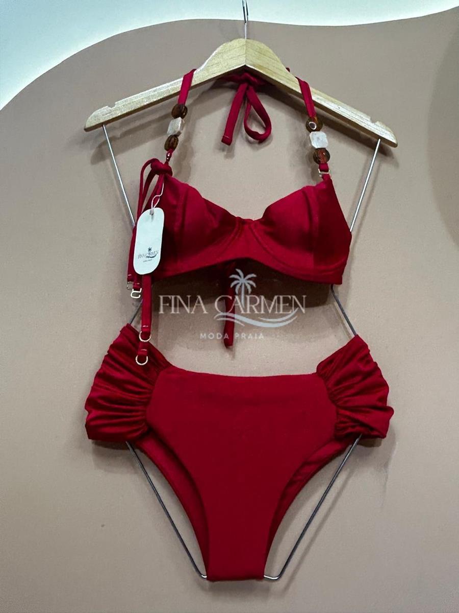 Clássico e sofisticado, o biquíni vermelho com bojo e calcinha de cintura alta é a escolha perfeita para quem busca conforto e elegância à beira-mar. O top estruturado com bojo oferece excelente sustentação e valorização do busto, enquanto as alças com detalhes em contas trazem um toque artesanal e moderno. A calcinha de cintura alta modela a silhueta com charme retrô e muito estilo.