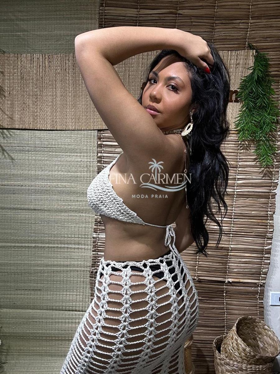 Delicado e artesanal, o conjunto de crochê branco com top e saia longa vazada é a combinação perfeita entre elegância e estilo praiano. Confeccionado à mão, o top ajustável valoriza o busto com amarração no pescoço e nas costas, enquanto a saia longa apresenta trama aberta que garante leveza e movimento. Um look encantador e atemporal para dias de sol com muito charme.