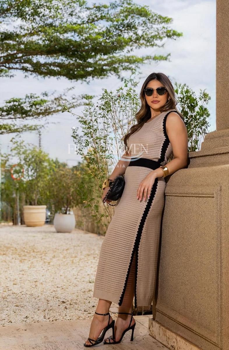 O Conjunto Crochê Areia com Detalhe Preto é a definição de elegância natural e estilo resort chic. Feito em crochê artesanal, o conjunto combina top sem mangas e saia midi com fenda lateral, criando uma silhueta alongada e sofisticada. O contraste do bege areia com o preto adiciona um toque moderno e refinado, perfeito para quem aprecia peças versáteis e cheias de personalidade.