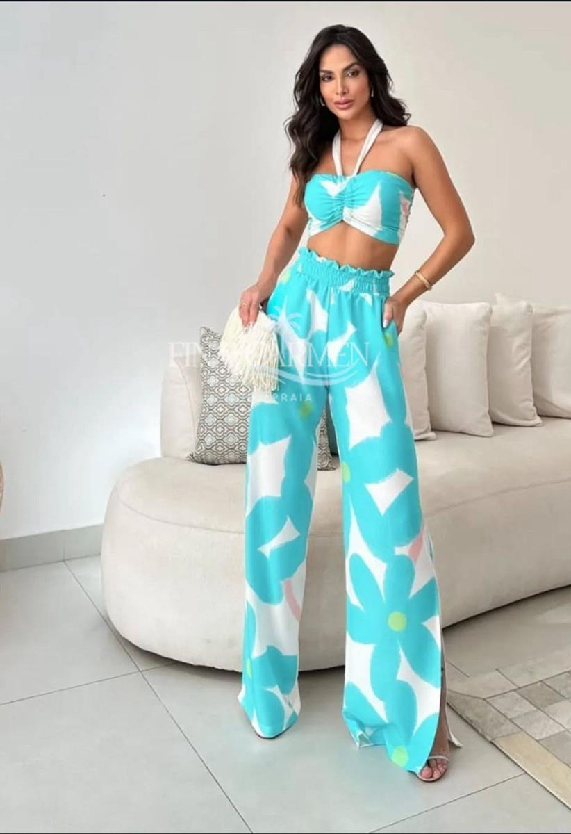 O Conjunto Floral Turquesa traz frescor e elegância para os dias de sol. Composto por top faixa com amarração halter e calça pantalona fluida, o look combina leveza e estilo em uma estampa floral vibrante que é a cara do verão.