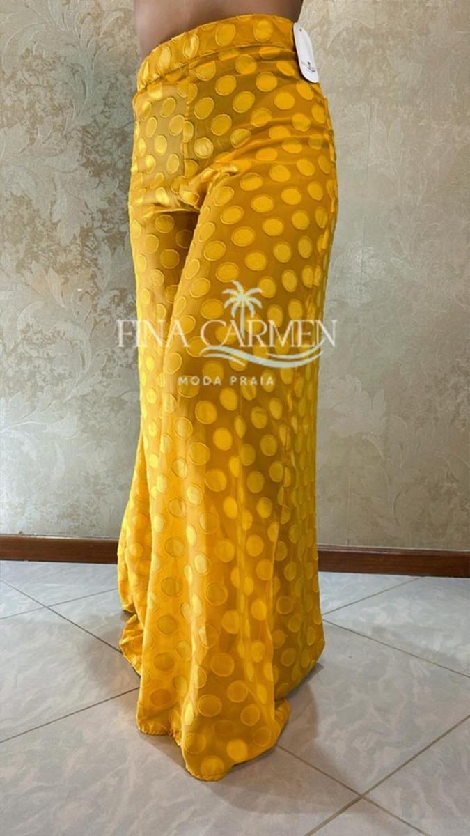 A Calça Amarela Solar Chic é a tradução perfeita da energia do verão em uma peça sofisticada e cheia de personalidade. Seu tecido leve com textura em alto-relevo e brilho sutil cria um visual vibrante e elegante, ideal para composições que vão do dia ensolarado à noite à beira-mar.