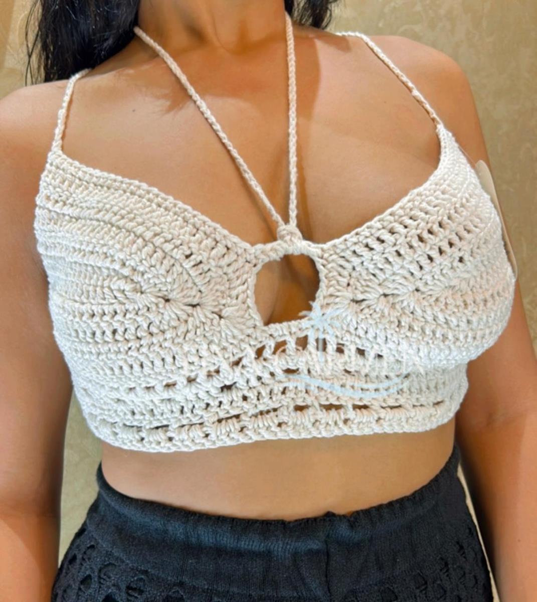 O Top Crochê Laço Natural une o charme artesanal ao design moderno, com um recorte central em forma de argola que realça o colo de forma delicada e sofisticada. Feito à mão com linha de algodão, possui amarração no pescoço e ajuste nas costas, proporcionando conforto e sustentação.