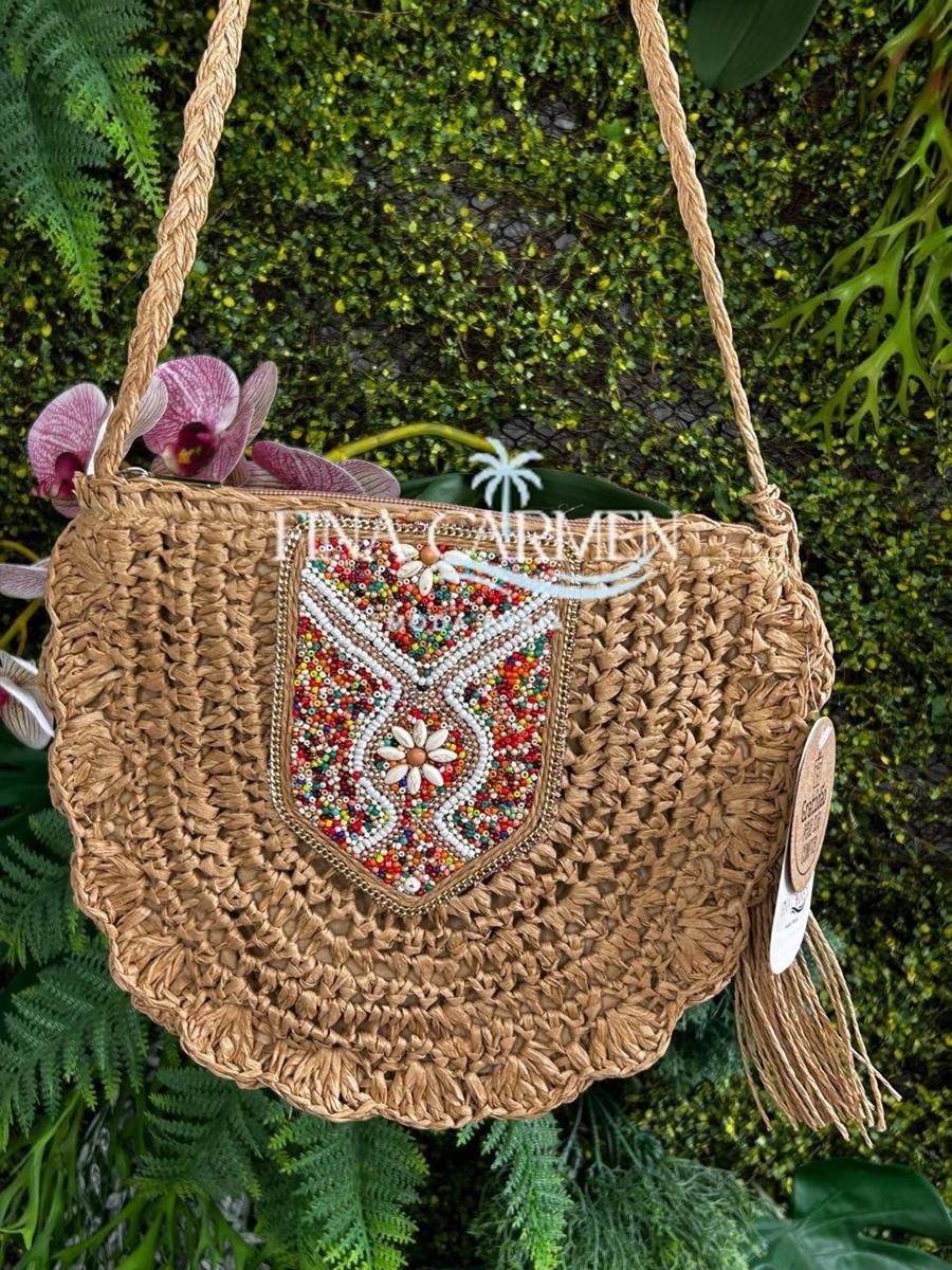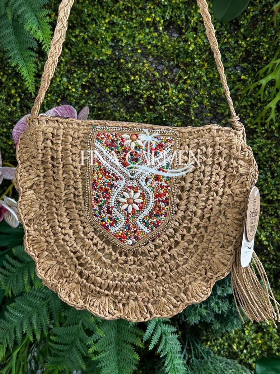 A Bolsa Palha Mandala Terra une o encanto artesanal com a energia das cores naturais. Produzida em palha trançada com formato meia-lua e acabamento rendado, ela traz um bordado manual em miçangas coloridas e pedrarias que formam uma mandala floral central — símbolo de equilíbrio e feminilidade.