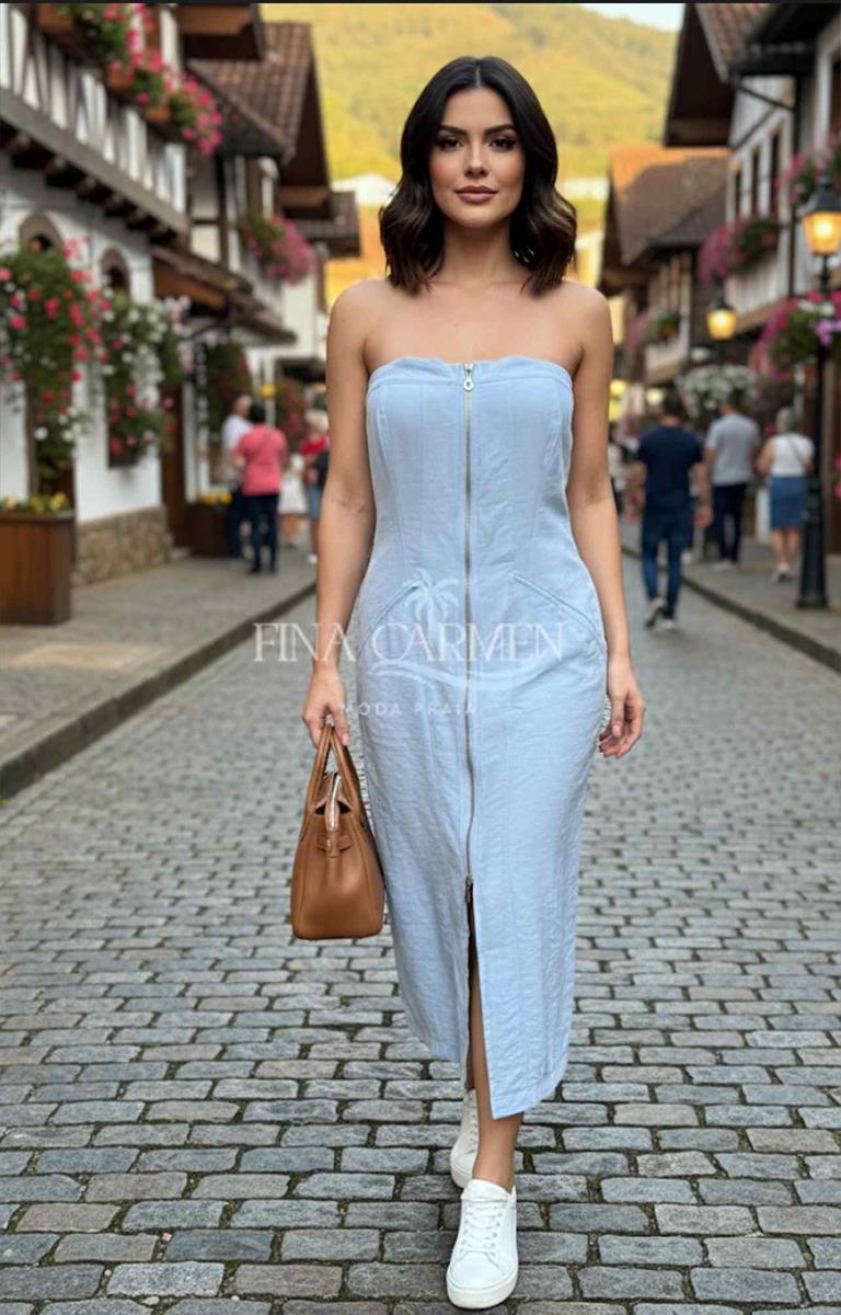 O Vestido Tomara que Caia Denim Zip une modernidade e elegância num visual marcante e minimalista. Feito em tecido estilo denim leve, ele modela o corpo com naturalidade e oferece conforto sem perder a sofisticação. O design tomara que caia realça o colo, enquanto o zíper frontal full-length garante personalidade, praticidade e um toque urbano contemporâneo.