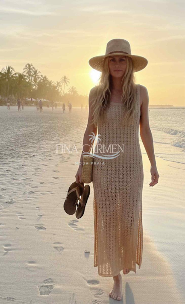 O Vestido Crochet Areia Dourada é a essência do resort chic. Confeccionado em crochê trabalhado, ele cria um visual leve, sofisticado e naturalmente elegante, perfeito para acompanhar o pôr do sol à beira-mar.