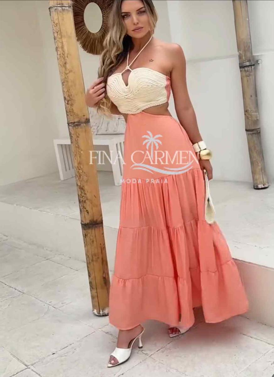 O recorte frontal em V alonga a silhueta e ilumina o look, enquanto a saia leve, com movimento suave, entrega conforto absoluto e estética resort premium. O tom coral suave reforça o mood de verão sofisticado, ideal para quem busca presença sem exageros.